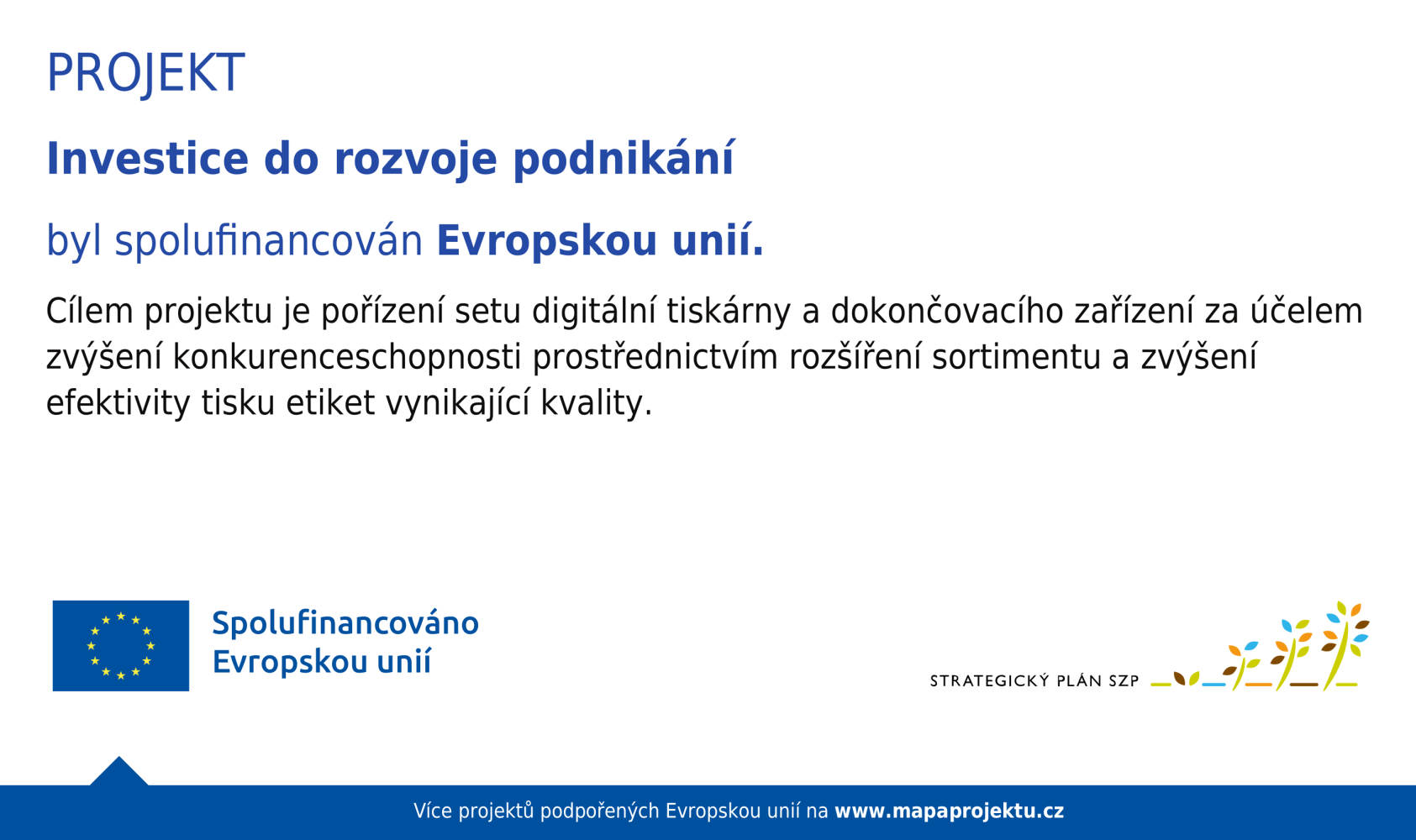 Tiskárna, kterou jsme pořídili s využítím podpory EU, SZP a MAS Hustopečsko, tiskne etikety na roli, finišer automaticky vyřeže tvar, vyseparuje přebytečný materiál a případně ještě etikety i laminuje a znovu navine na roli. Etikety navinuté na roli upřednostňují vinaři před etiketami na arších, které jsme dělali dříve, a to hlavně z důvodu automatické / poloautomatické aplikace. Děkujeme za podporu: